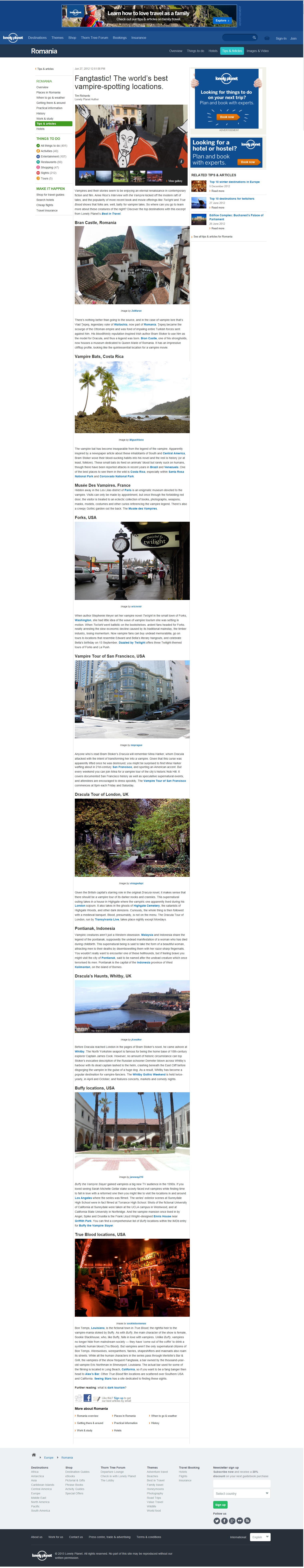 Vampires and their stories seem to be enjoying an eternal renaissance in contemporary fiction and film. Anne Rice’s Interview with the Vampire kicked off the modern raft of tales, and the popularity of more recent book and movie offerings like Twilight and True Blood shows that folks are, well, batty for vampire tales. So where can you go to learn more about these creatures of the night? Discover the top destinations with this excerpt from Lonely Planet’s Best in Travel. download PDF
